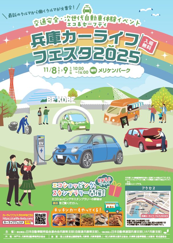 お知らせ 2025年11月4日 兵庫カーライフフェスタ2025に出展します 令和7年11月8日(土)-9日(日)メリケンパークにて開催される「兵庫カーライフフェスタ2025」に 神戸市道路公社も出展いたします。 神戸市道路公社の取り組みなどのパネル展示や、自由に撮影できる顔出しパネルなどを用意しています。 また、道路パトロールカーや標識車(回収車)の展示を行いますので、ぜひお立ち寄りください! 一覧へもどる