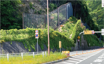 道路や利用者を守るため、丈夫な落石防止柵を設置しています。大きな石が転がり落ちても道路に届かないようにする大切な設備です。