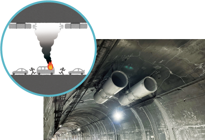 長いトンネルにはジェットファンなどの換気設備が設置されています。火災時には、風向きや風速を調整し、煙が広がるのを抑えることで安全に避難しやすい環境をつくります。