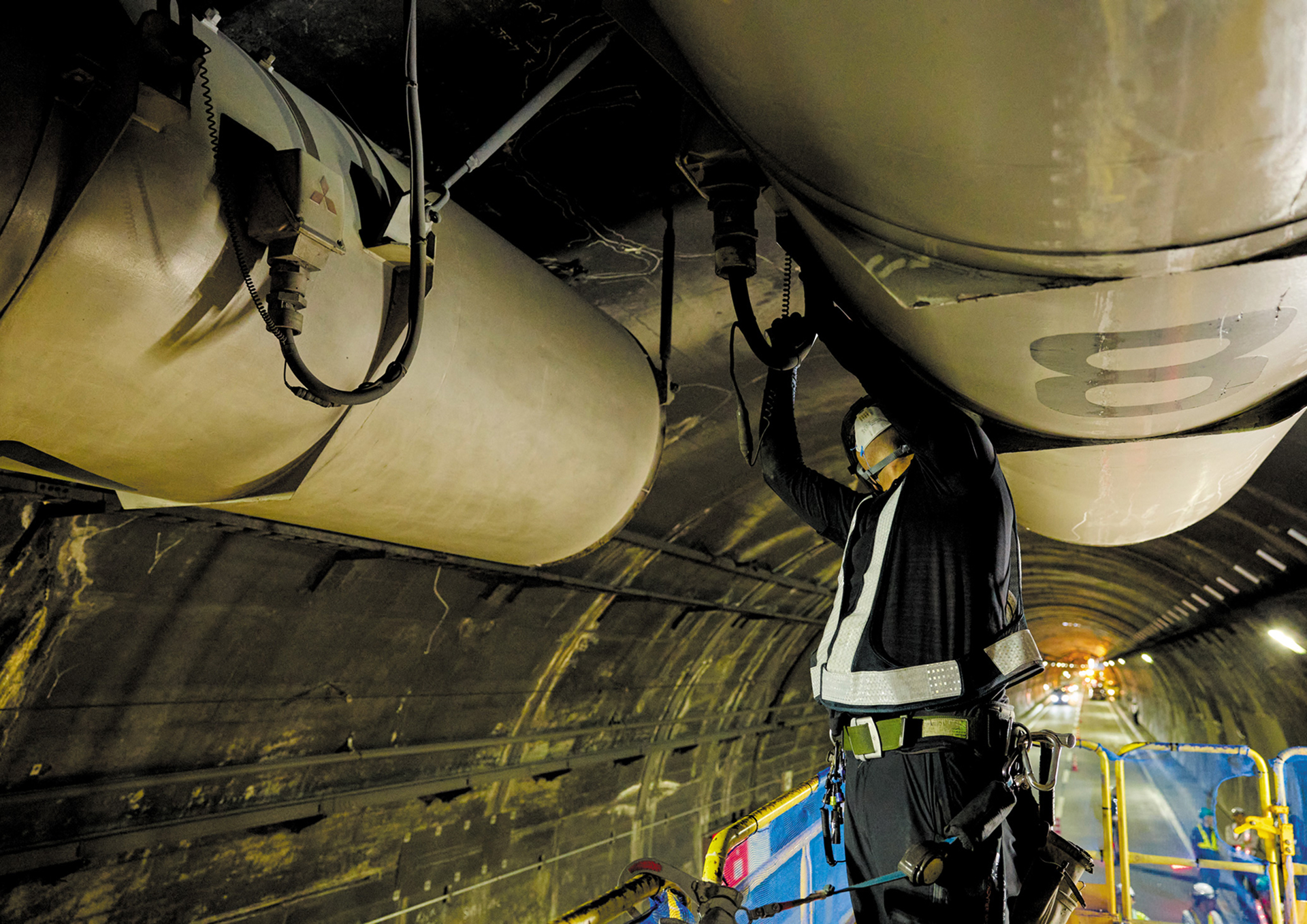 長いトンネルにはジェットファンなどの換気設備が設置されています。火災時には、風向きや風速を調整し、煙が広がるのを抑えることで安全に避難しやすい環境をつくります。